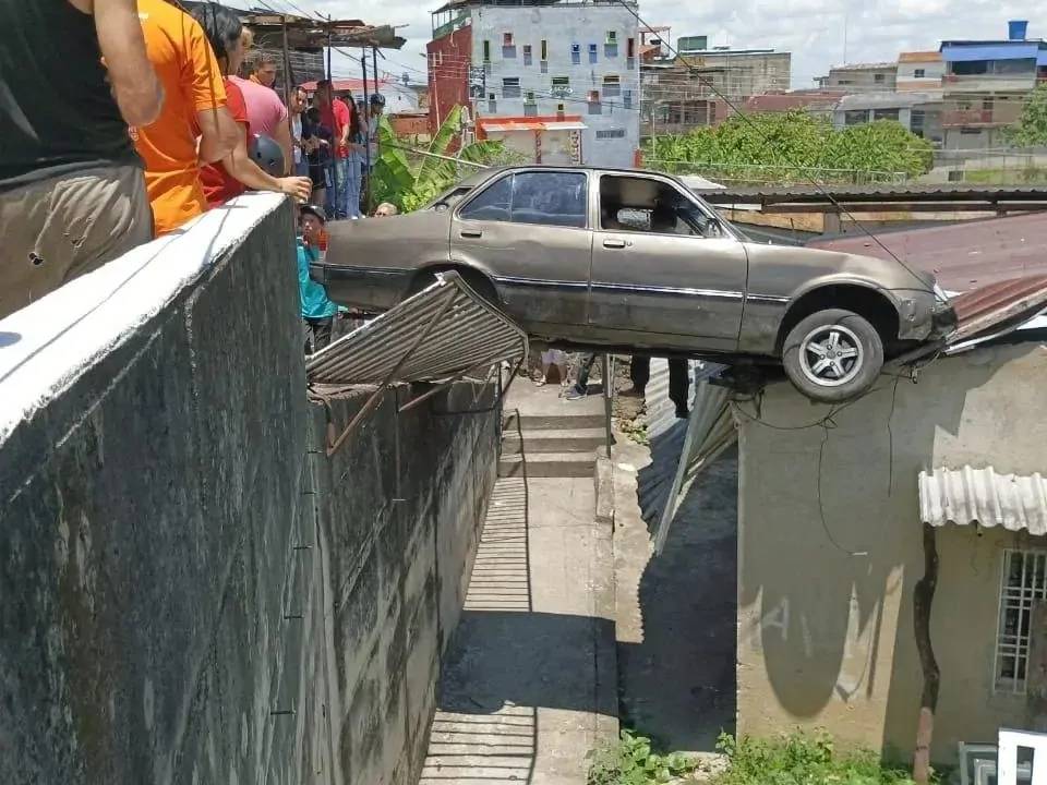 Este sorprendente incidente ocurrió el domingo 15 de septiembre y fue captado en imágenes que rápidamente se compartieron en redes sociales. En las fotografías se puede apreciar cómo el automóvil quedó atrapado entre la acera y el techo de la vivienda adyacente a la vía principal, generando asombro entre los transeúntes y vecinos.